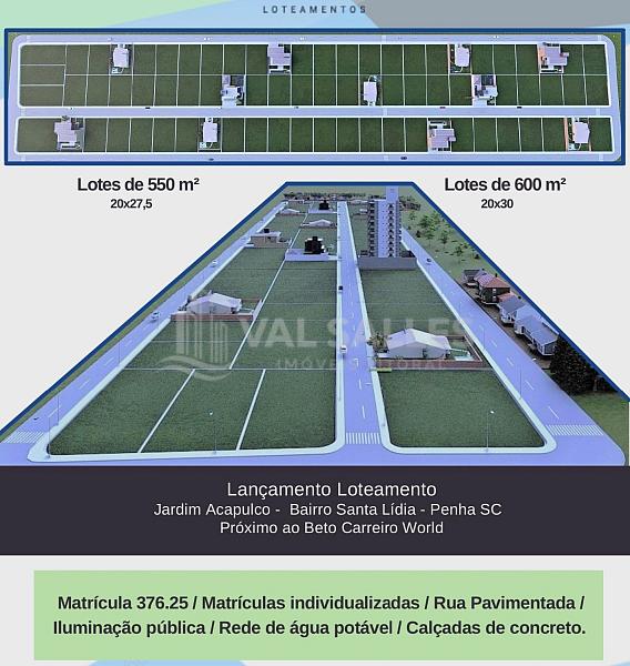 Investidor, essa pode ser a sua última chance de lucrar alto no litoral catarinense. Apresentamos uma oportunidade estratégica para você: o loteamento Jardim Acapulco, localizado em Penha, cidade que é impulsionada pelo turismo, infraestrutura e expansão imobiliária, com uma localização privilegiada. A menos de dois quilômetros das praias de Penha, ao lado do Parque Beto Carrero World — com mais de dois milhões de visitantes por ano — e apenas dez minutos da BR-101. Penha teve uma valorização imobiliária em média de 25% nos últimos 24 meses, crescimento constante da procura de imóveis para moradia, aluguel por temporada e empreendimentos comerciais. Com lotes amplos e prontos para construir, de 550 metros quadrados ou 600 metros quadrados, rede de água e iluminação entregue, matrículas individualizadas e documentação 100% regular — ideal para construção, revenda ou incorporação